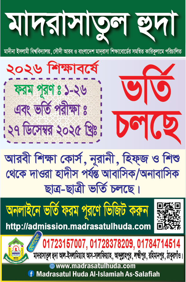 সুখবর, সম্মানিত অভিভাবক মন্ডলীর জন্য সুখবর। সন্তানকে নিয়ে আর দুশ্চিন্তা নয়। ইসলাম ও আধুনিকতার ছোঁয়ায় আলোকিত মানুষ তৈরীর ব্যতিক্রমধর্মী নির্ভর যোগ্য দ্বীনি শিক্ষা প্রতিষ্ঠান মাদরাসাতুল হুদা আল-ইসলামিয়্যাহ আস-সালাফিয়্যাহ এখন আপনার হাতের নাগালেই।