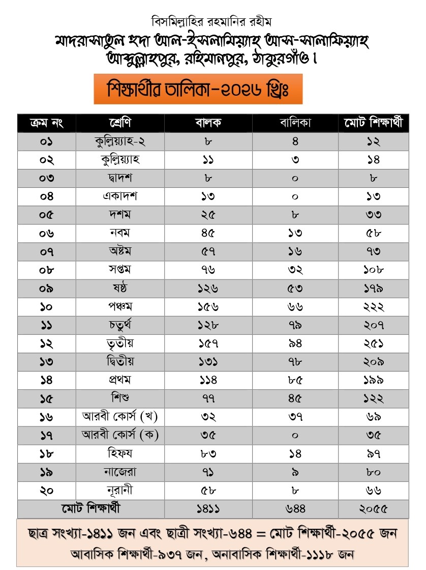 শ্রেণি ভিত্তিক শিক্ষার্থীর সংখ্যা